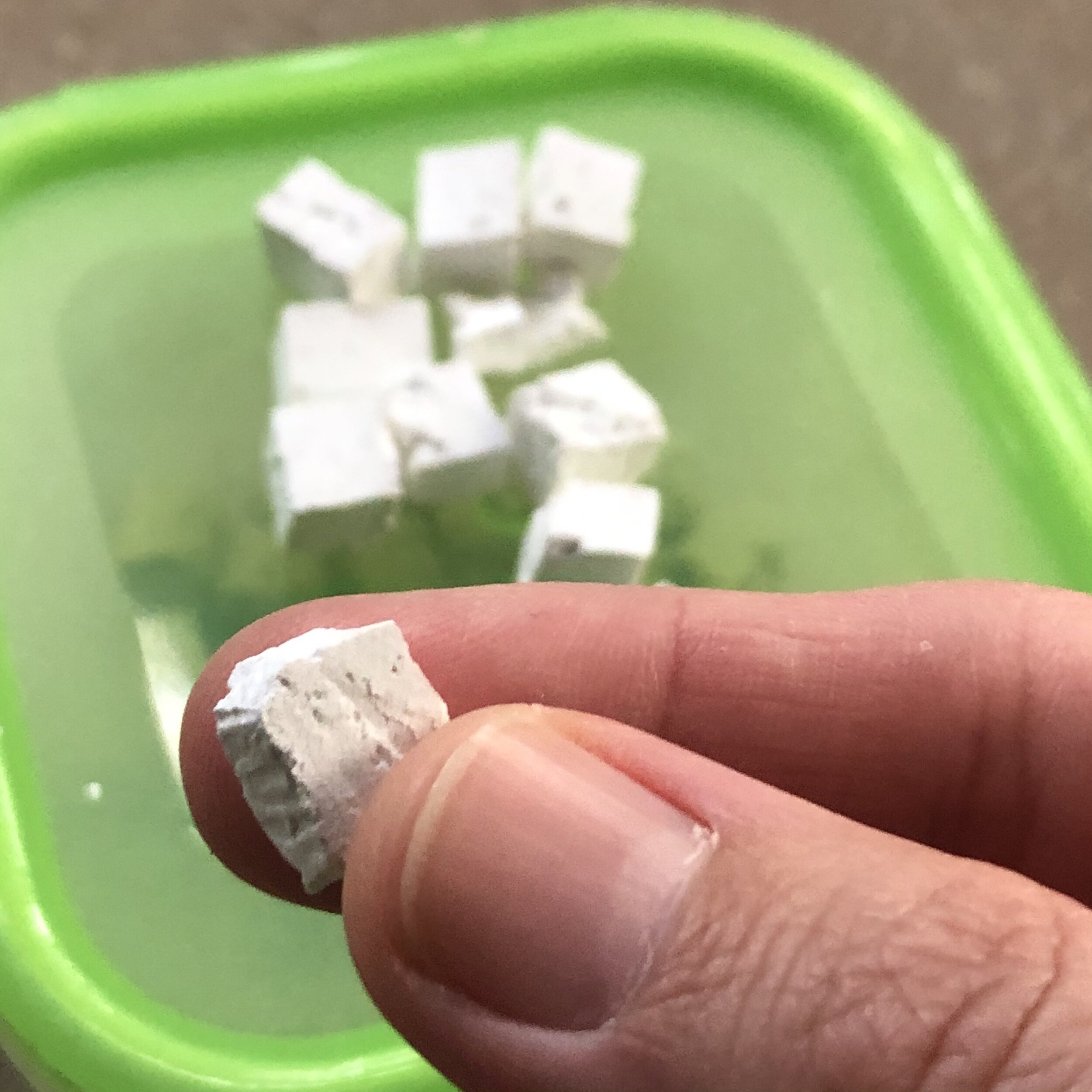 The calcium carbonate wadding was made by mixing half and half calcium carbonate and plaster to water. I had to guess about the amount of water, so I put the amount for plaster, plus 35% of the weight of the calcium carbonate. It worked pretty well, but was maybe a bit thick for pouring into my mold. One of the great advantages of this method is that you can cast it into any stilt shape you want. I used a silicone mold meant for making chocolate chips. Pointy and sturdy.